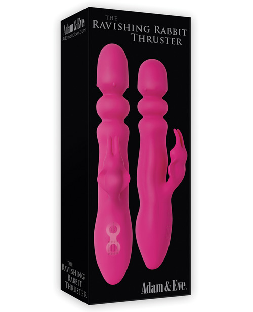 Adam and Eve Ravishing Rabbit Thruster Vibrator from Evolved Novelties. This big bunnys got a secret weapon! Not only is it a seven speed, body safe silicone, beautifully designed vibe, but it can also thrust until you bust with a deeply satisfying orgasm! At the press of a separately controlled button, the contoured tip will thrust and rotate simultaneously, penetrating almost a whole inch wherever you want it most. That combined with the powerful clitoral piece is sure to send you over the edge! And do not be shy to take this humping rabbit into the bath or shower with you, as it is completely waterproof and submersible. Clean up in a snap with Adam & Eve toy cleaner and a warm water rinse. Features: large thrusting multispeed vibrator. Thrusting motion mimics real sex Made from luxurious smooth silicone. Motor in tip has 7 rotating and thrusting functions. Thrusts almost 1 inch. Shaft does not vibrate. Motor in clitoral piece has 7 powerful vibration functions. Easy to use two button control. Motors controlled separately. Waterproof and submersible. Material: Silicone Length 8.5 inches insertable width 1.5 inches. Fully rechargeable, USB cable included. 5 year warranty.