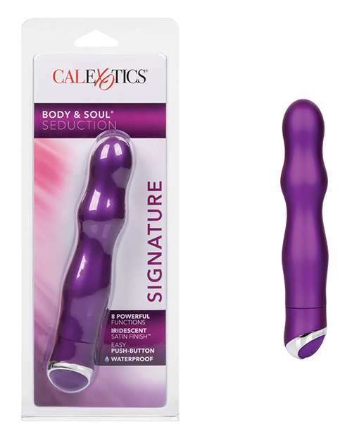 The Body & Soul Seduction from Cal Exotics is a seamless, silky smooth massager. A pleasing shape for versatile use. Designer iridescent satin finish. 8 powerful functions of vibration, pulsation, and escalation. Easy push button controller. Hold button for 3 seconds to turn off. ABS with Metallic Plating/ PU Cote (massager) ABS with Silver Plating (decor) Silicone (button). 6″ x 1.25″/15.25 cm x 3.25 cm. requires 2 AAA batteries, not included.