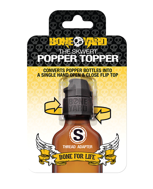 I think it is safe to say we have all spilled a bottle of Poppers in the throw! The Popper Topper turns your popper bottle into a 1-handed, flip top. No more slippery, 2 handed battle with the bottle! In the past getting the bottle open takes 2 hands, keeping track of the removable cap is always a challenge and then actually screwing the cap back on…all while you have more important things to focus on! With the Popper Topper just use your thumb to click it open and closed for a tight seal without rubber gaskets to lose. Helps prevent spilling, staining and waste. The nose cone inserts into your nostril perfectly so you can get all the whiff. The size is based on the thread and opening size, not the bottle size.