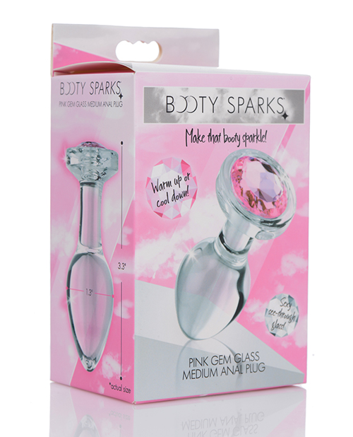 Adorn your derriere with a dazzling gem! These glassy Booty Sparks anal plugs are crystal clear and super smooth to provide a solid texture just for your backdoor. Perfect for warming up your hole for further pleasure, or as a standalone anal toy – the rigid body and super smooth surface presses firmly against your walls for an incredible satisfying squeeze! Simply lube up and insert to make that booty sparkle! Enhance your ass with a bright pink gem to entice your lover and prep your booty for some rougher play. The glass material is naturally hygienic and body safe so you can play worry free. Resistant to odors and easy to clean before and after use, these glass gems are a staple to any toy collection. Perfect for temperature play – heat or chill these glass plugs to provide an extra layer of pleasure! This medium plug is 1.3 inches at its widest diameter, with a 2.7 inch insertable length – great for experienced players! Smooth and tapered for easy and comfortable entry and compatible with all lubricants so you can play your way. Measurements: Overall length 3.3 inches, insertable length 2.7 inches, diameter at widest point 1.3 inches. Materials: Glass, ABS Plastic.