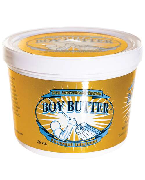 Boy Butter 10th Anniversary Edition is a special golden gift to the connoisseurs of fine personal lubricants. Back in 2003 Boy Butter Lubricants debuted the first oil based lubricants consisting of coconut oils and an organic silicone blend homogenized to perfection into the world’s first totally water soluble and easily washable personal lubricant formula perfect for both men and women alike. Boy Butter looks like real butter but is even better, lasting as long as any synthetic or silicone lubricant yet washes off with water alone from both skin and fabric. Gentle, multipurpose and safe on all toys. Plus, a portion of the proceeds of Boy Butter Gold goes to global reforestation projects, so it is as green as it is gold. NOT Latex Condom Compatible – Can be used with Polyurethane Condoms like Durex Avanti and Trojan Supra. Ingredients: Partially Hydrogenated Vegetables Oils, Glycerin, Polysorbate 60,Tocopheryl Acetate, Glyceryl Stearate, Phenyl Trimethicone. 16 oz tub.