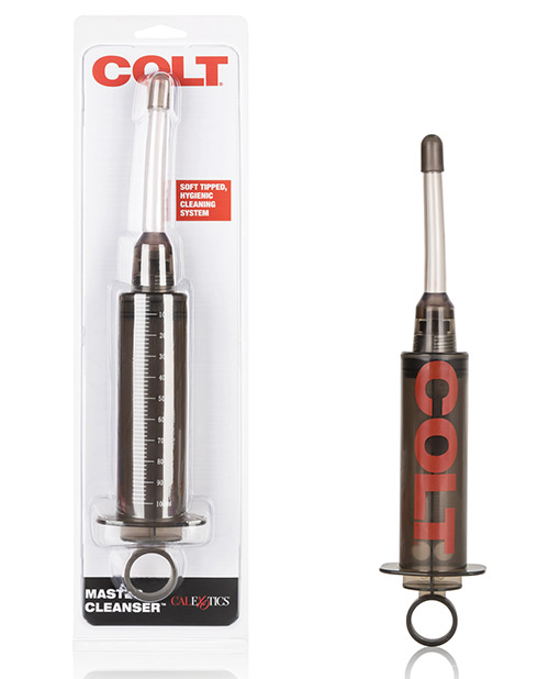 Colt Master Cleanser is a hygienic cleansing system with universal measurements. Fill with your favorite liquid, holds up to 3.5oz. Soft and pliable tip is removable for easy cleaning. Made from PP (syringe, cap), ABS (connector), Phthalate-Free PVC (nozzle), and Silicone (ring). Measures 4.75″ X .5″. From Cal Exotics.