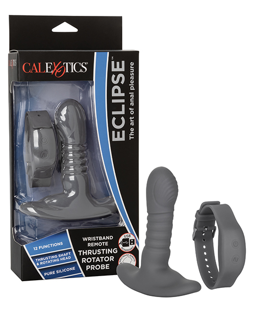 The Eclipse Wristband Remote Thrusting Rotator Probe is a sensual silicone probe created to ease you into thrilling anal pleasure. The sleek wristband remote controls 12 powerful vibration functions with intense synchronized rotating, thrusting actions and two powerful motors. The stylish, yet discreet wristband controller makes it easy for you or your lover to control vibration intensity with the touch of a button. Whenever or wherever passion takes you, this passionate vibrator’s 32-foot radius range and 12 intense functions of intense stimulation are ready for playtime. Choose the intensity of your pleasure and ride the waves of orgasmic internal stimulation with synchronized rotation, vibration and thrusting actions. The sensually curved shaft, contoured base and easy-push control allows you to dive deep into effortless stimulation. Two powerful vibration motors in the shaft and base deliver rumbling backdoor stimulation, while the contoured body flexes and moves with you during your most X-rated moments. Enjoy comfortable insertion, effortless stimulation and gentle removal with the gentle ergonomic shape, flexible design and curved base. Recharge the premium silicone massager in 90 minutes with the provided USB charging cable to enjoy 45 minutes of high-speed stimulation or 60 minutes of low speed vibrations. While the easy button controls the intensity and the plump probe gives you the stimulation you want, the integrated state of the art memory chip remembers just how you like it by starting on the last function used.