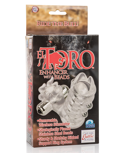 Indulge in red-hot passionate action with the El Toro Enhancer with Beads.The seductive sensually ribbed erection enhancerfeatures a bull shaped clitoral teaser head and removable wireless bullet stimulator. You and your partner will enjoy the sensational power of the bull, which provides tantalizing orgasmic vibrations. The El Toro Enhancer with Beadsis made from super soft and ultra stretchy phthalate free TPR, and features 2 silver plated stimulation beads for maximized sensitivity application. The translucent ribbed sleeve offers stamina support for mind-blowing and prolonged rock hard performances.The bullshaped teaser delivers precision clitoralstimulation to satisfy her every desire. The discreet El Toro Enhancer with Beadsis ideal for enhancing intimacy and excitement. The easy to use push button bullet stimulator inserted into the sleeve for erotic vibrations, can also be used for independent stimulation of erogenous zones all over the body. Waterproof. Materials Thermoplastic Rubber, ABS Plastic / Metallic Plating Power Source 3 Watch Batteries (Included) Measurements 2.2″ x 0.6″ / 6cm x 2cm (Bullet) 2.75″ x 3.5″ x 1.25″ / 7cm x 9cm x 3cm (Enhancer)
