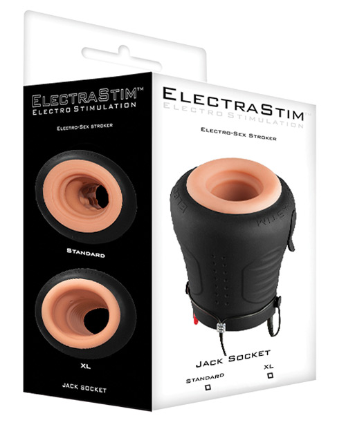 The ElectraStim Jack Socket is a double award-winning compact realistic stroker. It has a curvaceous internal texture, skin-like movement and a lifelike feel, but the similarities with other men’s sex toys ends there. With a squeezable outer case applying adjustable pressure and bipolar 2mm connection for an estim stimulator, the realistic sleeve comes to life; making your shaft throb and pulsate with pleasure. Relax and tighten your grip to enhance sensation and use plenty of water-based lube to intensify your pleasure with every stroke.Although the size difference between the two may seem subtle, the extra space within the sleeve of the XL allows for a more comfortable experience for men with a penis girth to 1.9inches (diameter). The XL sleeve has an indented ‘ribs’ texture that produces a subtle suction sensation during use. A tube of conductive gel is also included. XL Orifice minimum diameter: 37mm (1.45?) XL Orifice maximum diameter: 48mm (1.9?)