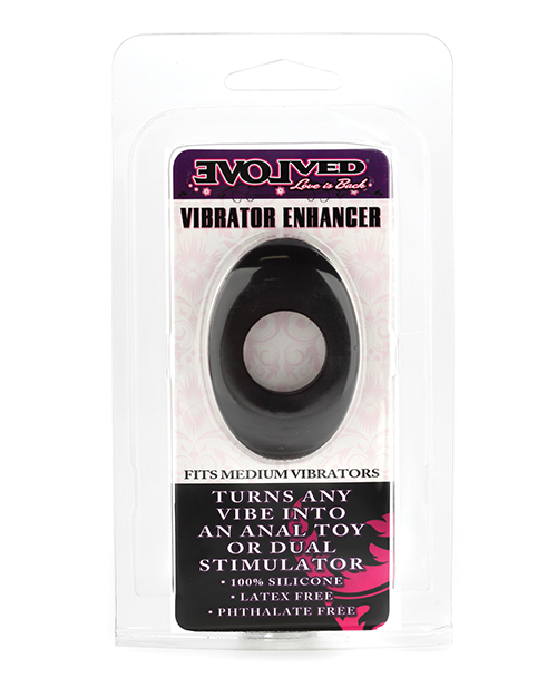 Turn any toy into a double duty performer with this unique vibrator enhancer. Latex and phthalate free this pure silicone ring fits over any vibrator to offer extra clitoral stimulation or a safety stopper for anal play. The ring itself provides external stimulation and the flared base keeps any toy from slipping too far. Get the most from your toys with this must-have accessory