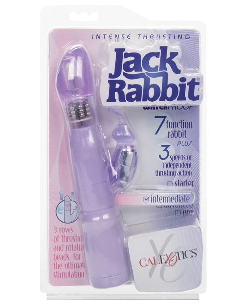 Intense Thrusting Jack Rabbit Purple Vibrator. Perfectly sized Jack Rabbit with incredible thrusting and rotating power. Rabbit has 7 intense functions of vibration, pulsation and escalation. 2 speeds of synchronous rotating and thrusting action. 3 solid rows of non-jamming rotating beads. Easy push button controls with auto off. Waterproof vibrations. Safe and pure for body and pleasure made using phthalate free materials Thermoplastic Elastomers TPE rabbit. ABS plastic controller. Silicone buttons. 4.75 inches by 1.5 inches shaft. 2.25 inches by 1 inch rabbit. Vibrator requires 4 AAA batteries, not included. Bulk weight 9.4 ounces. From Cal Exotics.