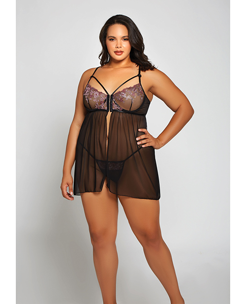Steal all your sweetie’s kisses in this romantic plus size babydoll set featuring sheer underwire cups, strappy chest detail with a hook and eye front closure, adjustable spaghetti straps, a sheer open mesh bodice, and a matching g-string panty.