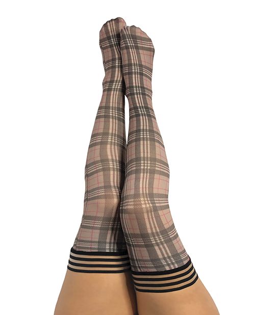 Classic and sophisticated tan and black plaid thigh highs. A day or night wardrobe essential. Kix’ies thigh highs are designed for all-day wear, with a no-slip-grip.
