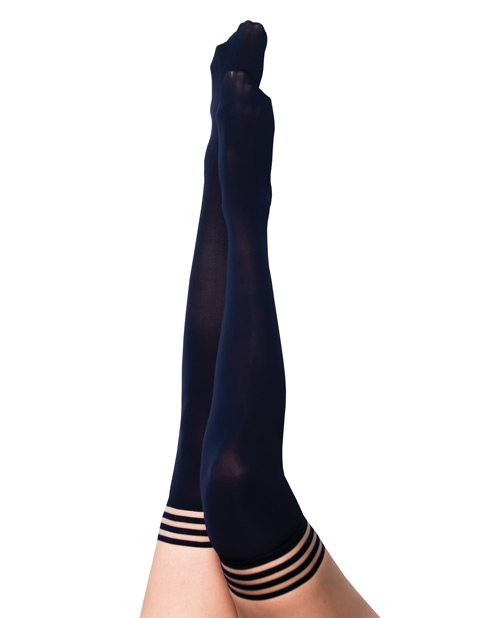 Navy opaque thigh highs with a no-slip grip.Size C. Height: 4’11” – 5’5”. Weight: 140-240+ lbs. Thigh Circumference: Up to 30in..