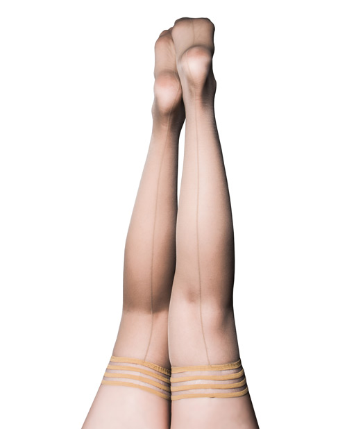 You’ll Be the Toast of the Town in Champagne Nude Back Seam Thigh highs. No slip grip. Size A. Height: 4’11” – 5’5”. Weight: 90-140 lbs. Thigh Circumference: Up to 20in.