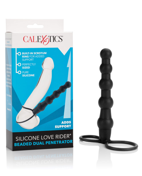 The Silicone Love Rider Beaded Dual Penetrator turns your pleasurable encounters into a memorable orgasmic experience. The sturdy beaded probe lets you spice up your erotic activities without the need to invite a third person along. With this versatile penetrator, you can share the experience of the ‘filled up’ double penetration feeling with your lover. The flexible shaft features a selection of smooth, graduated beads that provide intense pleasure. For comfortable and pleasurable insertion, the penetrator shaft also has stretchy loops that slip over the erect penis and provide testicular support. For increased satisfaction, always use a quality lube with this exotic toy. The penetrator offers flexible stimulation and climax options, and can also be used with a strap on. The Silicone Love Rider Beaded Dual Penetrator is perfect for adventurous first-time and experienced users who want to enjoy a double P experience. Alternate the insertion location for maximum thrills and unlimited ecstasy. Before and after every use, remember to clean the penetrator with a toy cleaner spray or wash it in warm, soapy water. Material: Silicone Color: Black Dimensions: 5.75″ x 1″/ 14.5 cm x 2.5 cm