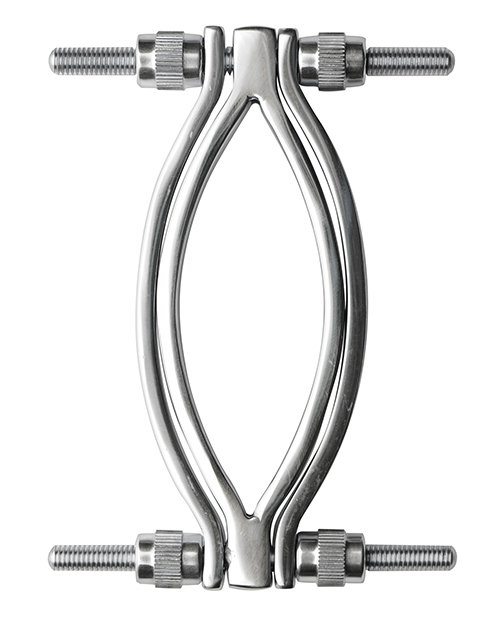 Get creative with the tease and torment of your partners most delicate parts! This clamp allows you to spread those labia wide open, granting you access to their clitoris and vagina. Use the thumbscrews to open up the exteriors of the clamp and pull their inner or outer labia through. Tighten the thumbscrews to secure the device, leaving them trapped in pinching pain and pleasure! The heavy-duty stainless steel is durable enough to last you through many years of inventive use. Measurements: Innermost opening is 3.3 inches in length, 1.15 inches in diameter. Each side of the clamp opens to 1.25 inches in width. Material: Stainless steel. Color: Grey.