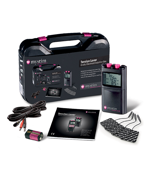 Which Tension Lover is supposed to make you happy? The stable plastic-box includes not only the digital Mystim stimulation device, two electrode cables and a 9v battery, but either four self-adhesive electrodes or four permanent silicone electrodes. The self-adhesive electrodes are extremely flexible and can be used repeatedly. Due to the one-sided isolation, the slightly more expensive silicone electrodes lack some flexibility, but have a longer life span.