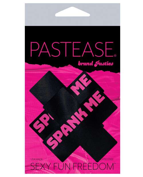 Plus X: Liquid Black Cross with Pink ‘Spank Me’ Nipple Pasties by Pastease(R) are hand-made in the USA of soft form-fitting material that forms seamlessly to curves and resists wrinkling over hardening nipples. Just peel-and-stick on clean, dry skin. All Pastease(R) feature latex-free, medical-grade, waterproof adhesive that stay securely in place for as long as you like and until they are gently removed. Conceal or Reveal with Pastease(R) nipple pasties when worn with a sexy outfit, daring bikini, sheer top, revealing dress, Hefty bag, body lotion, crazy costume, party theme or nothing at all! Dimensions: 3 X 3 inches Coverage Diameter: 1.6 inches