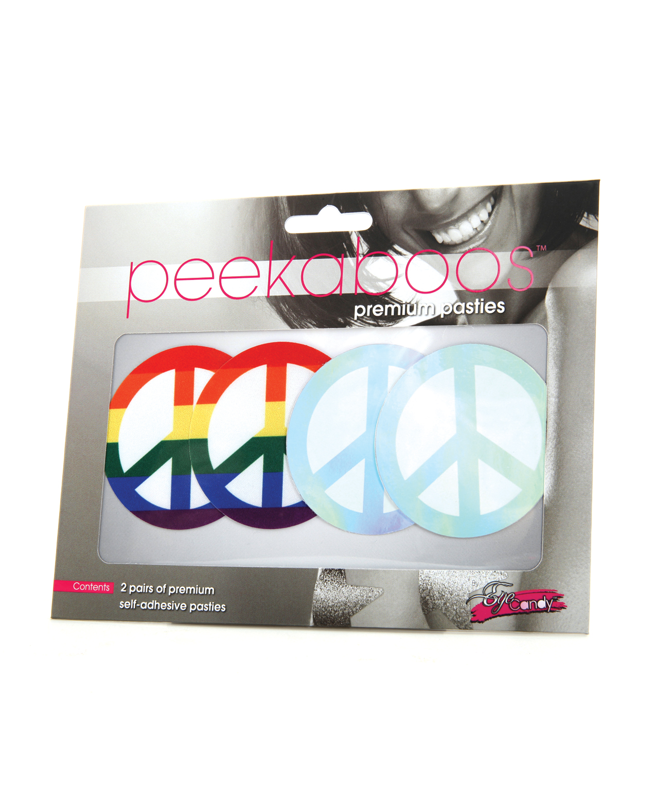 Peekaboos Premium Pasties. Wear more revealing fashions! Cover up with style! Lasts as long as you do. Dance all night without even a slip. Fun as a flirty fashion add-on or just as premium pasties. Contains two pairs of premium self-adhesive pasties. Pride Peace Sign.