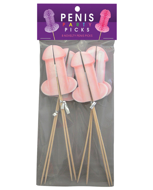 Penis Party Picks from Kheper Games. Poke some naughtiness and fun into any party! 8 Penis-shaped honeycomb tissue paper decorations in assorted pink and purple, attached to a wooden skewer pick.