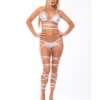 Don’t feel strapped down in this sexy bra set featuring adjustable triangle cups with halter straps, a strappy bottom with a tie back closure, and a matching panty with strappy sides, a sheer cheeky cut back, and strappy wrap around leg wraps with ankle tie closures. Color: Gold M/L. Bust: 33in.-37in. Waist: 25in.-29in. Hip: 35in.-39in. Cup: B/C. Dress: 10-12.