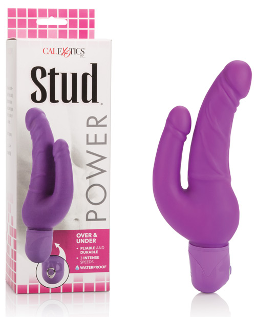 The Waterproof Power Stud Over & Under Dong from Cal Exotics combines traditional designs with a contemporary flair. Body safe, push-button 3-speed controller, and 100% waterproof. This soft and flexible vibrator offers 3 power packed speeds and push button control. Phthalate-Free PVC (vibrator) ABS/ABS with PU Cote (cap) ABS with Silver Plating (decor). Requires 2 AA batteries. 5.5″ x 1.75″/ 14 cm x 4.5 cm (large shaft). 3.5″ x 1″/ 9 cm x 2.5 cm (small shaft).