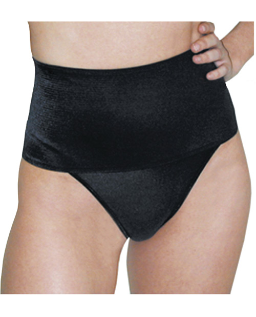 Made of 85% nylon, 15% spandex. Features: Four way soft shaping fabric gives perfect comfort to the thong design, a wide (6″) concealed band secures the waist of the garment and shapes the midriff, garment stays in place all day, soft control. From Rago. Black, XLarge. Dress Size: 16, Hips: 42″, Waist: 32″