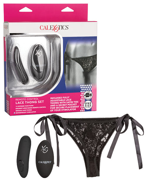 Indulge in your newest dirty little secret with the Remote Control Lace Set. This sexy set includes a stretch-to-fit tie-on lace thong, curved panty teaser and a discreet remote control with a range of up to 32′ (10 m). Whenever or wherever passion takes you, this passionate mini vibrator’s 12 intense functions of vibration are ready for playtime. The sexy and stretchy lace panties feature a satin side ties discreet internal pocket for the perfect stimulator pocket. Machine washable and oh-so comfortable, these vibrating panties are made from extended wear and adventurous playtime comfortable.