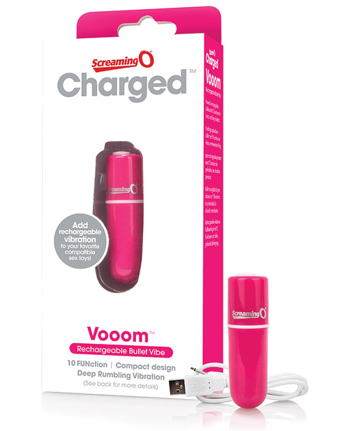 Enjoy powerful portable vibration with Charged Vooom, a unique 100% waterproof bullet vibe equipped with a 10-function motor that hums at a frequency unlike anything you’ve ever felt! Rather than a traditional buzz, this new technology rumbles deep for penetrating pleasure and a dramatically different sensation that can be enjoyed almost anywhere! Its sleek shape means it also can fit most existing Screaming O products and give them an intense power boost. At its highest speed, Charged Vooom vibrates for more than 60 minutes and recharges easily with a convenient USB connector (included) that plugs in securely and stays put for the duration of the charge – hassle-free charging at its finest! Charged Vooom also comes equipped with a 2-year limited warranty, so you can enjoy penetrating pleasure with confidence. Enjoy Charged Vooom on its own or use it to add powerful rumbling vibration to your favorite compatible intimate accessories!