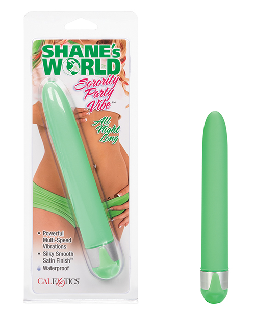 Party on with the Shane’s World All Night Long Sorority Party Vibe from California Exotics. The All Night Long is a silky smooth, multi-speed massager that is powerful, totally waterproof and lined with Velvet-Cote for your comfort. Extra power for long study sessions! Requires 2 AA batteries (not included). ABS with Velvet-Cote (PU Cote); Metallic Plating (cap band). 6.5″x 1″/ 17 cm x 3 cm. Green.