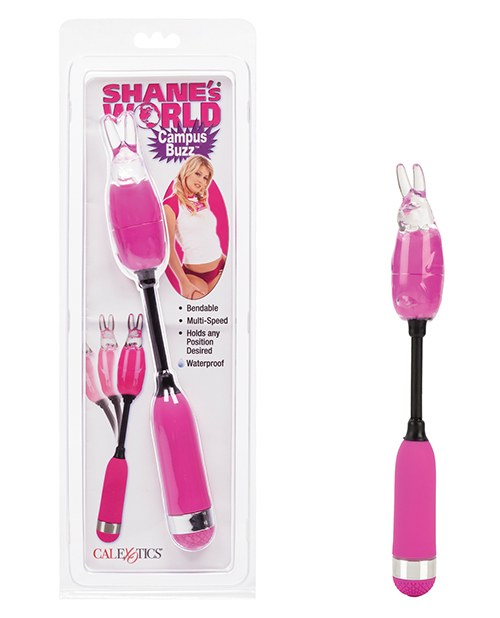 The Shane’s World Campus Buzz from California Exotics is a bendable massager that flexes, maintains perfect position, and moves with you. This powerful, multi-speed, satin finished massager also comes with a removable soft bunny sleeve for versatile use. Requires 2 AAA batteries (not included). 10.75″x 1.5″/ 27 cm x 4 cm (overall); 4″x 1.5″/ 10 cm x 4 cm (bunny). Purple.