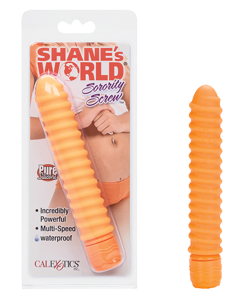 Shane’s World Sorority Screw Vibe from California Exotics is sensual, petite, and totally powerful! With its unique twist for added stimulation, this multi-speed, waterproof massager will provide hours of twisted pleasure. Requires 2 AAA batteries (not included). Silicone (massager) ABS (cap). 5″x 1″/ 13 cm x 3 cm. Orange.