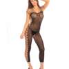 Sheer and lace meet in a seductive cut out garter bodysuit with diamanté details and strappy sides. Includes laced stockings.