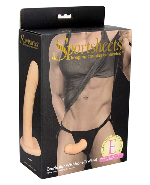 The Everlaster Wishbone Harness includes a 4 Way adjustable harness with ergonomic ball sack clearance and 1 Hollow dildo measuring 6.5 inches. Fit hips up to 69 inches.