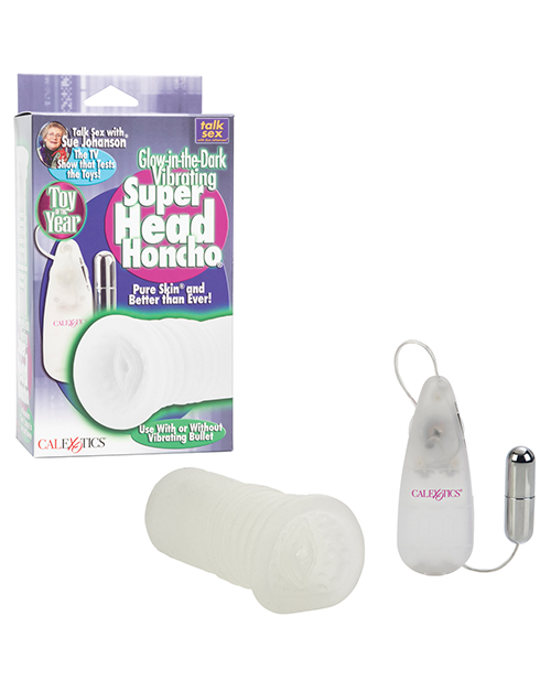 The award winning Head Honcho now vibrates and glows-in-the-dark! From Cal Exotics comes the Sue Johanson Glow-in-the-Dark Vibrating Super Head Honcho Masturbator. Use with or without a multi-speed vibrating bullet. It is an incredibly detailed, tight and stretchy stroker with a nubbed inner chamber. It features a life-like texture, superior suction, and ribbed for easy grip use. It’s maintenance free. Expose to any light source for maximum “glow”. Pure Skin/TPR (masturbator) PP (controller) ABS with Silver Plating (bullet). Requires 2 AAA batteries. 5.5″ x 2.75″.