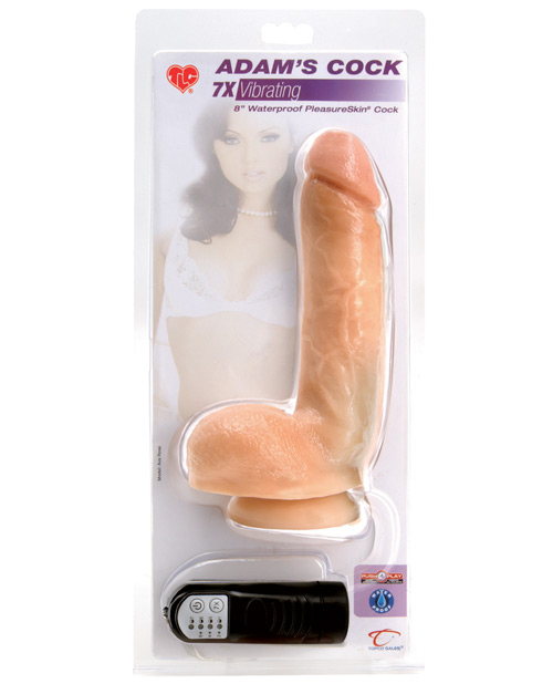 TLC Adam’s Cock Vibrating from Topco. 6.25 insertable inch (15.75 cm) realistic cock with thick, 2″ girth (5.4 cm). 7 functions of vibration and pulsation with powerful motor in the tip. Rigid yet flexible PleasureSkin material. Hand painted with lifelike details. Harness compatible suction cup base. Waterproof. 2-AA batteries (not included).