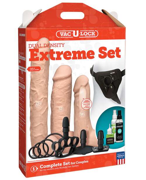 Recommended for very experienced players only, the Vac-U-Lock(TM) Dual Density Extreme Set offers deeper penetration and more intense feelings of fullness than any other complete Vac-U-Lock(TM) set with three extra-large attachments in dual density ULTRASKYN(TM), complete harness with removable o-rings and plug, and a bottle of Mood water-based lube. Measuring 10.5 inches, 12 inches, and an incredible 15.5 inches, these dual density attachments warm to body temperature with use and feature a soft, pliable exterior that gives way to a firm inner core, recreating the feel of a real erect penis. Attachments can be used with the harness, the included Vac-U-Lock(TM) suction cup and Knuckle-Up accessories, and any other accessory or harness in the line. The Vac-U-Lock(TM) Dual Density Extreme Set also includes Doc Johnson(R) Natural Toy Cleaner and ULTRASKYN(TM) Refresh Powder to properly and hygienically maintain your dual density ULTRASKYN(TM) attachments. Every product in the patented Vac-U-Lock(TM) system is designed to help you create any strap-on or toy you’re in the mood for, and it’s as simple as popping on the attachment of your choice. From Doc Johnson.