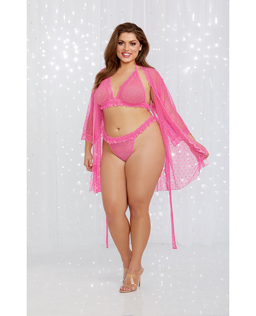 Valentines Heart Mesh Robe, Tri Cup Bralette & Thong Fuchsia 3X