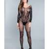 Wide Fishnet, Long Sleeve Bodysuit. One Size. Dress size 6-12, Bust 32-38 inches, Waist 23-29 inches, Hips 34-40 inches, Cup A-C.